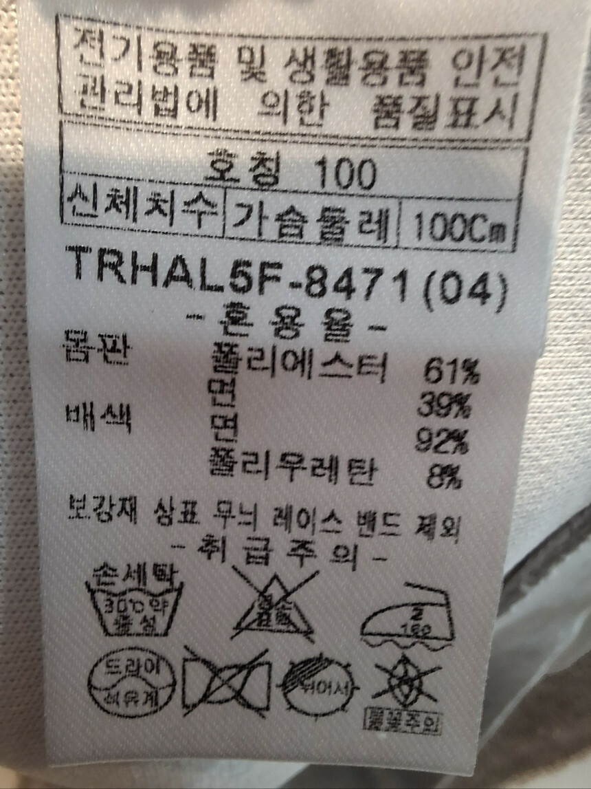 | 1. 제품 소재 (섬유의 조성 또는 혼용률을 백분율로 표시, 기능성인 경우 성적서 또는 허가서) | 폴리에스테르 61% / 배색:면 92%, 폴리우레탄 8% |