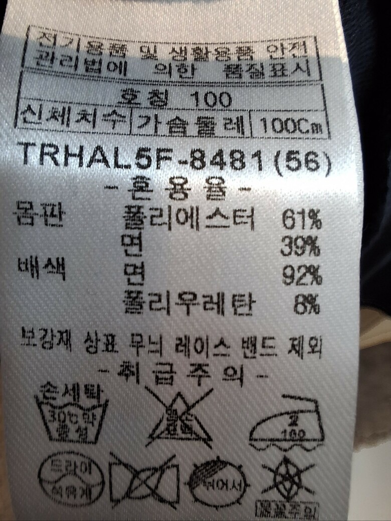 | 1. 제품 소재 (섬유의 조성 또는 혼용률을 백분율로 표시, 기능성인 경우 성적서 또는 허가서) | 폴리에스테르 61%, 면 92%, 폴리우레탄 8% / 배색:면 92%, 폴리우레 |