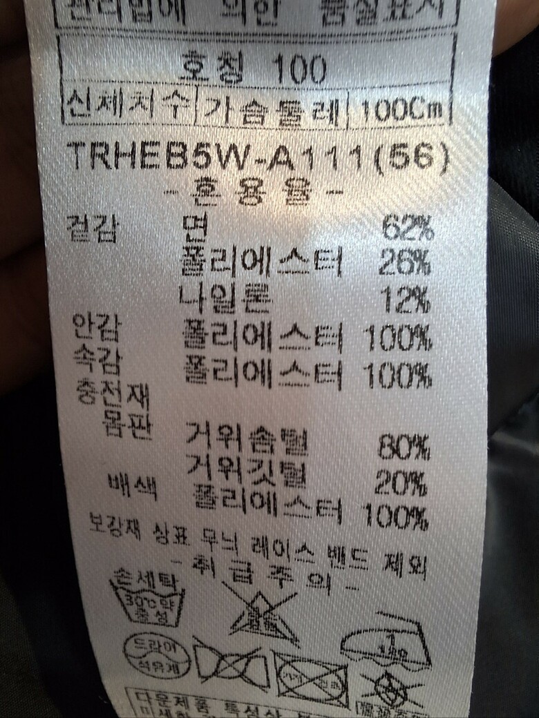| 1. 제품 소재 (섬유의 조성 또는 혼용률을 백분율로 표시, 기능성인 경우 성적서 또는 허가서) | 겉감:면, 폴리에스테르 26%, 나일론 12% / 안감:폴리에스테르 100% / |