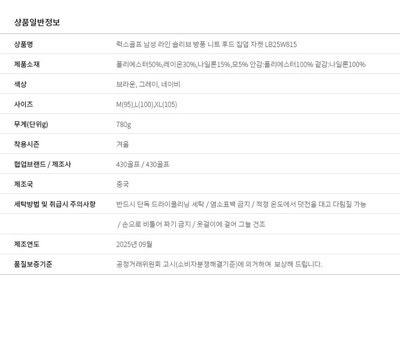 | 1. 제품 소재 (섬유의 조성 또는 혼용률을 백분율로 표시, 기능성인 경우 성적서 또는 허가서) | 상세설명참고 |