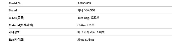 가니 A6893 038 체크 이지 라지 쇼퍼백 토트백