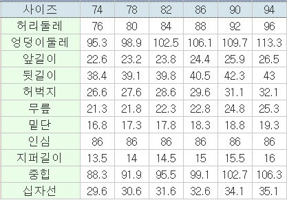 | 3. 치수 | 74(28~29),78(30~31),82(32~33),86(34~35),90(36),94(37~38) |