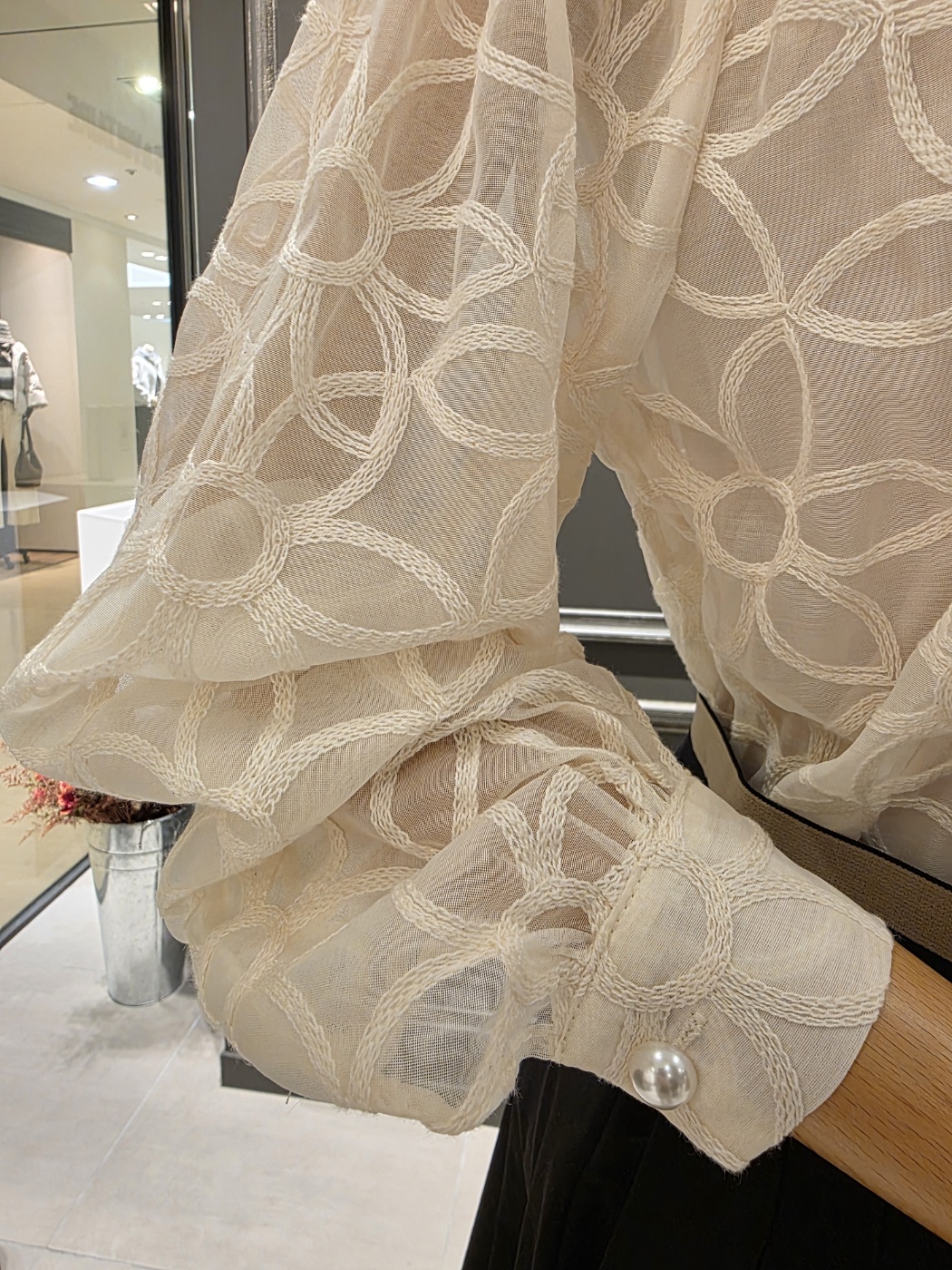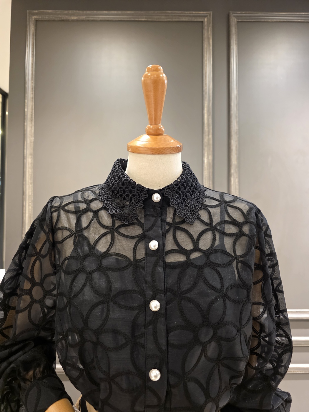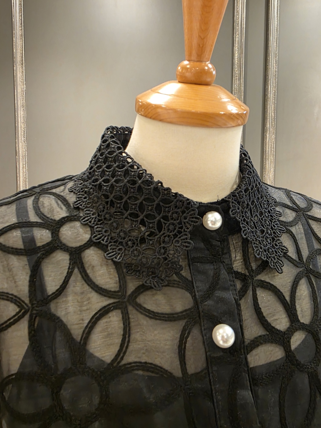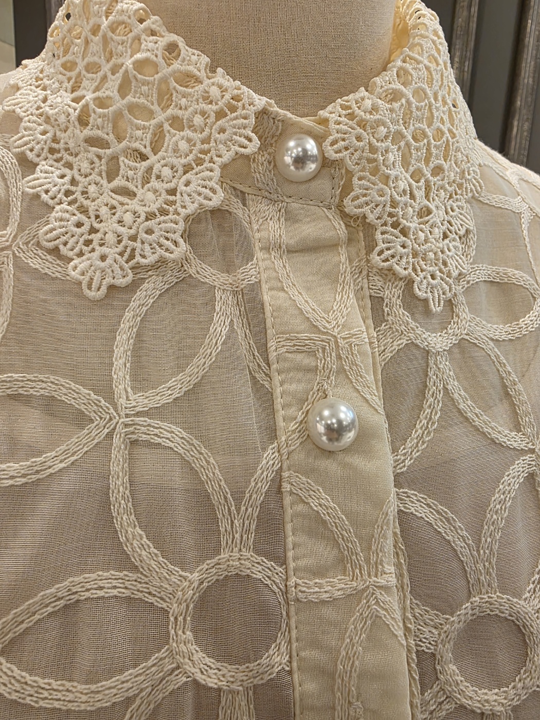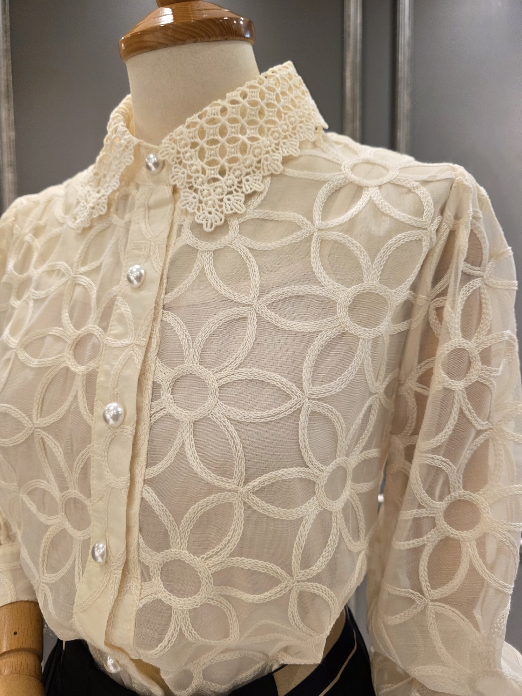 25년 F/W 신상품 레이스 넥 디자인의?진주 비즈 블라우스입니다