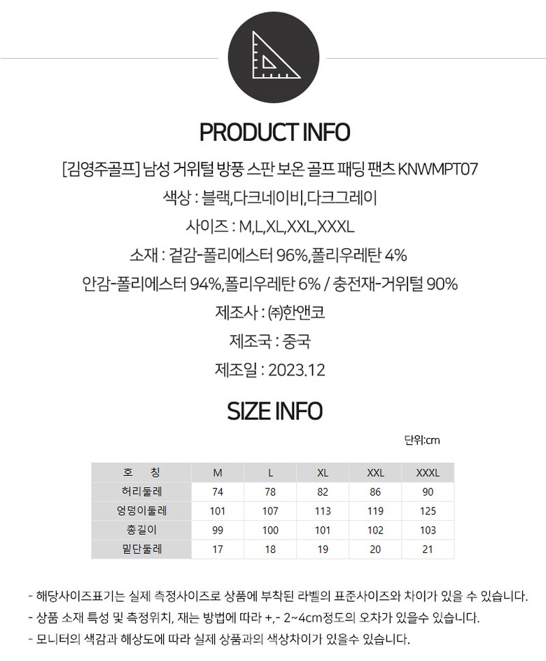 [김영주골프] 남성 거위털 방풍 스판 보온 골프 패딩 팬츠 KNWMPT07