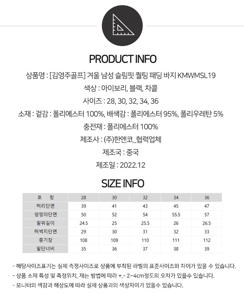 [김영주골프] 겨울 남성 슬림핏 퀄팅 패딩 바지 KMWMSL19