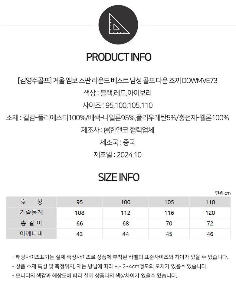 [김영주골프]겨울 엠보 스판 라운드 베스트 남성 골프 다운 조끼 DOWMVE73
