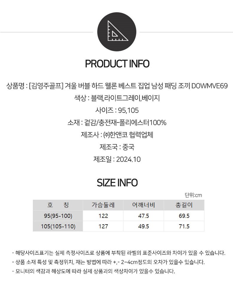 [김영주골프] 겨울 버블 하드 웰론 베스트 집업 남성 패딩 조끼 DOWMVE69