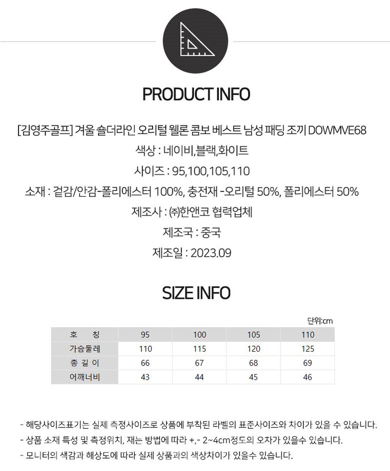 [김영주골프] 겨울 숄더라인 오리털 웰론 콤보 베스트 남성 패딩 조끼 DOWMVE68
