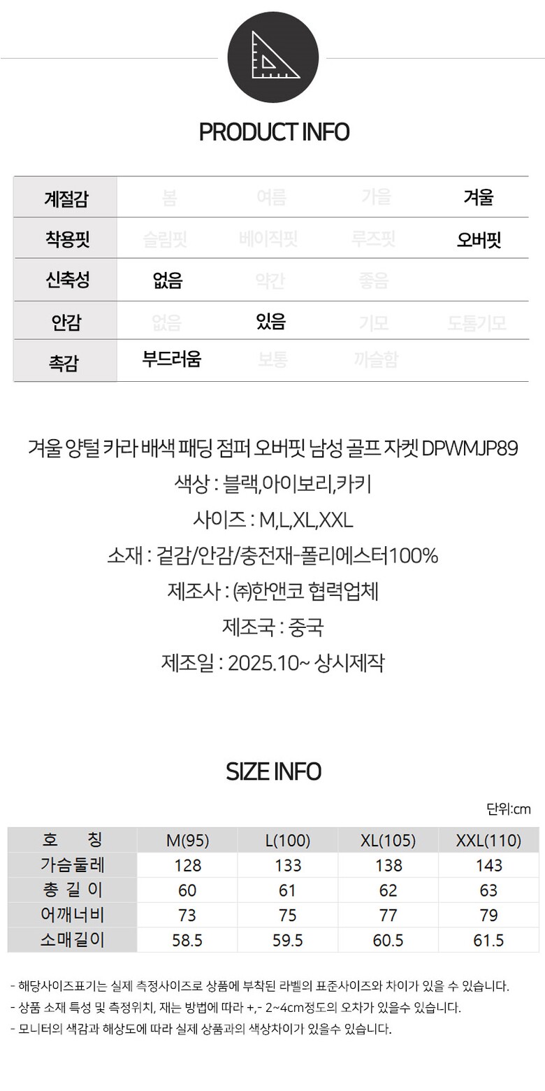[김영주골프] 겨울 양털 카라 배색 패딩 점퍼 오버핏 남성 골프 자켓 DPWMJP89