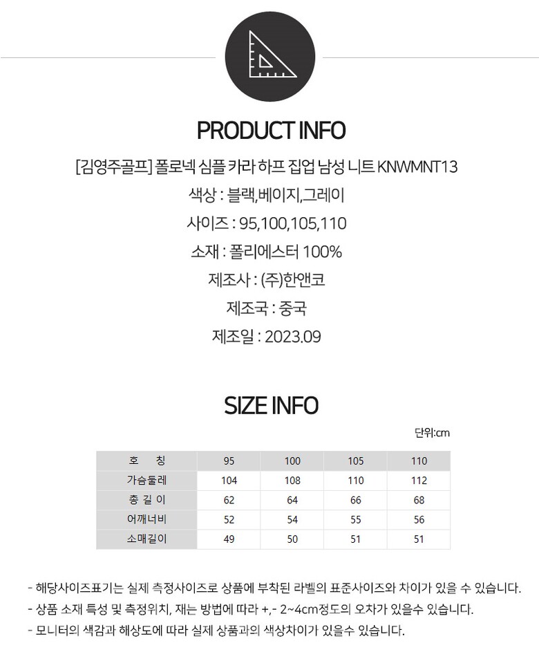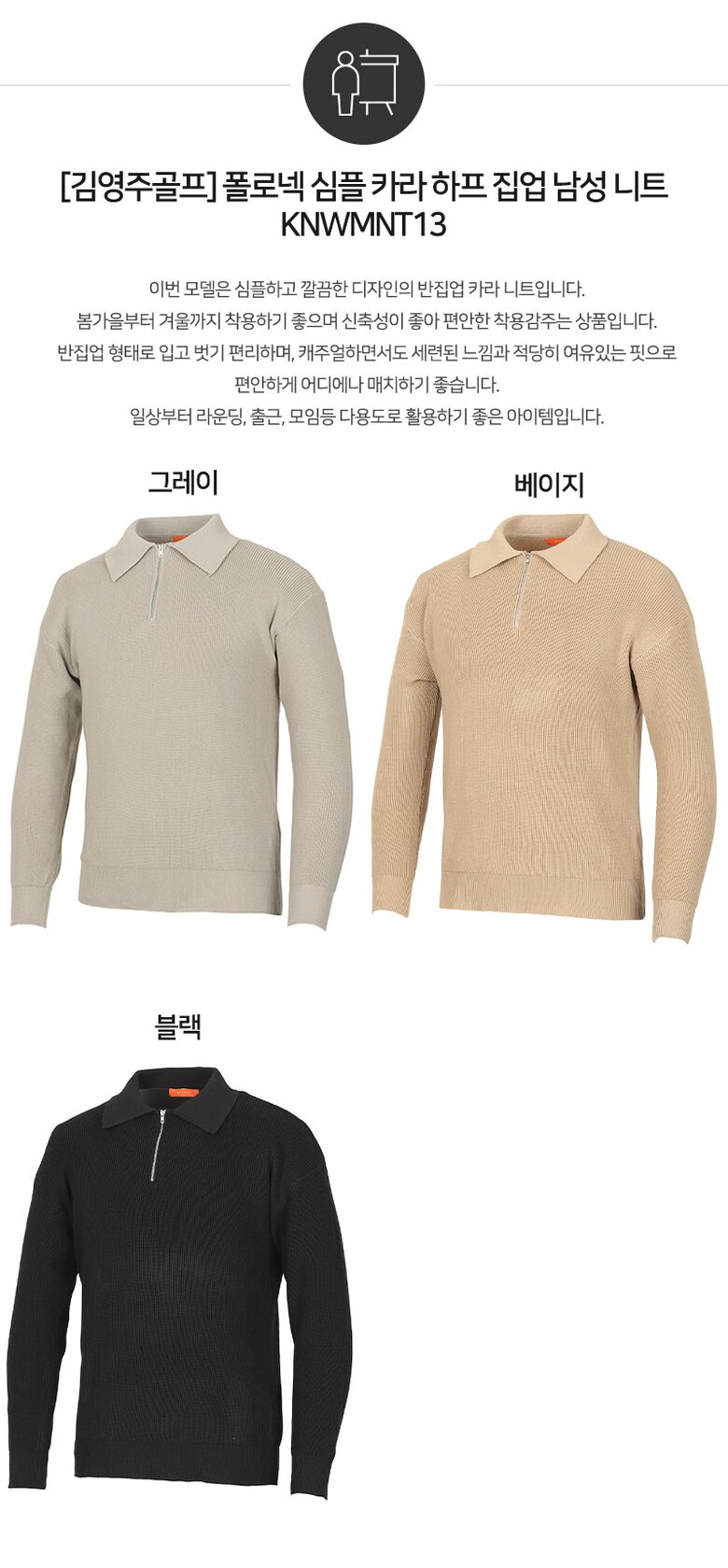 [김영주골프] 폴로넥 심플 카라 하프 집업 남성 니트 KNWMNT13