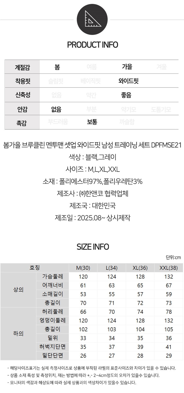 [김영주골프] 봄가을 브루클린 멘투맨 셋업 와이드핏 남성 트레이닝 세트 DPFMSE21