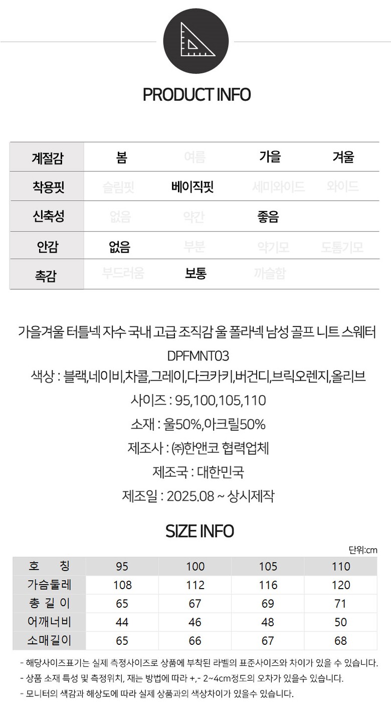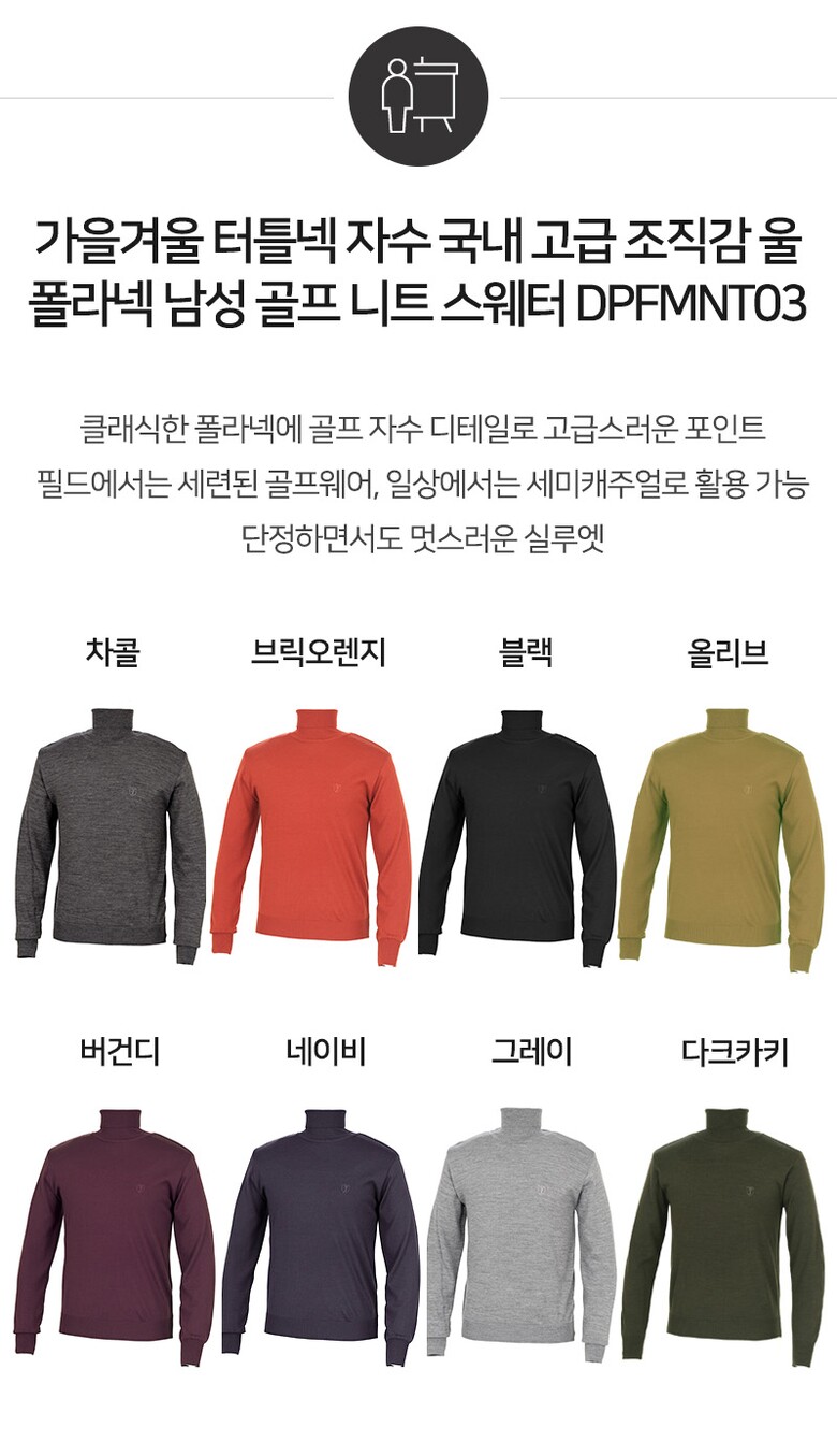 [김영주골프] 가을겨울 터틀넥 자수 국내 고급 울 폴라넥 남성 골프 니트 스웨터 DPFMNT03