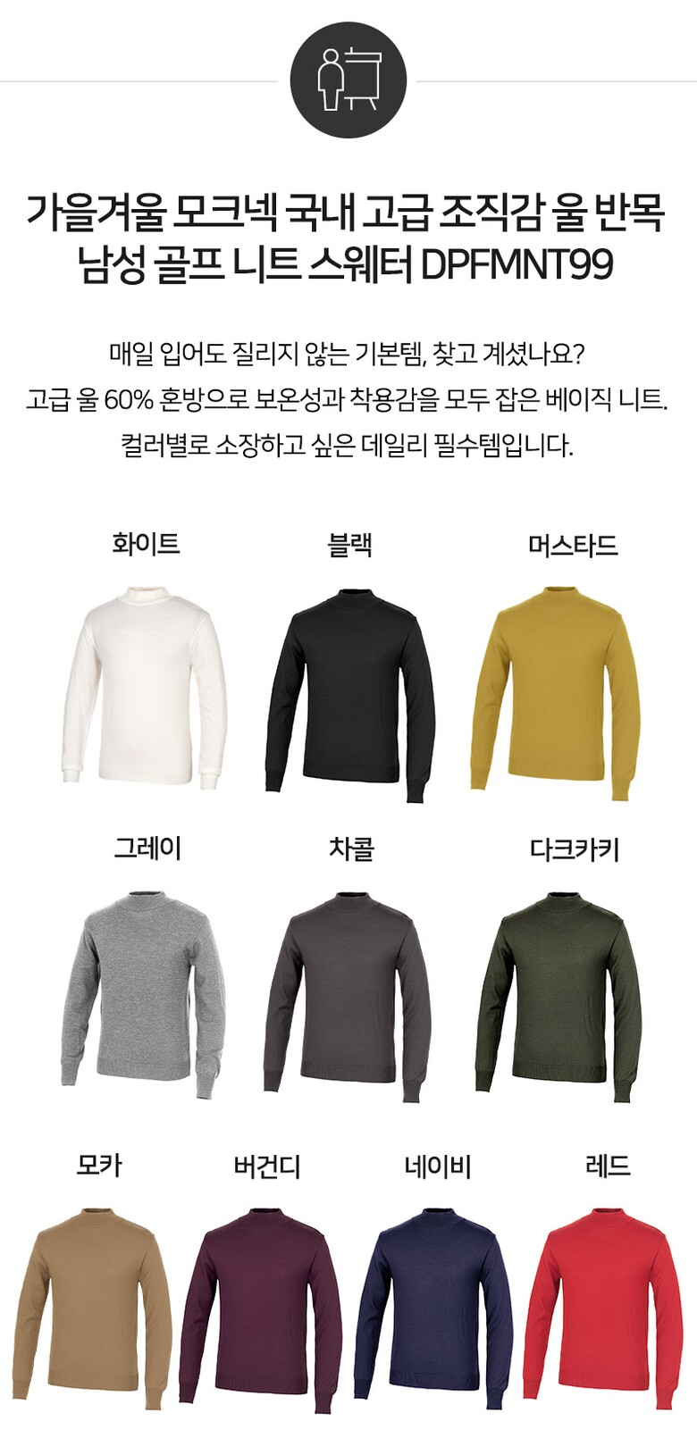 | 2. 색상 | 블랙,네이비,차콜,그레이,다크카키,버건디,레드,모카,머스타드,화이트 |
