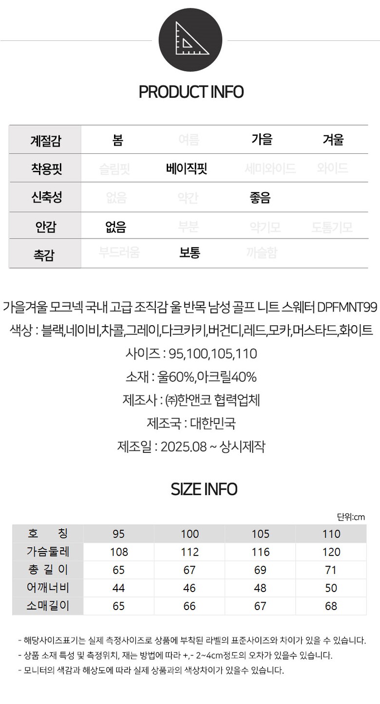 [김영주골프] 가을겨울 모크넥 국내 고급 조직감 울 반목 남성 골프 니트 스웨터 DPFMNT99