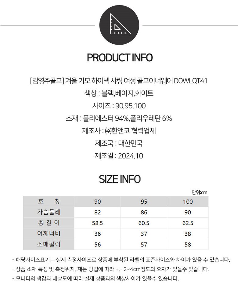 [김영주골프] 겨울 기모 하이넥 샤링 여성 골프이너웨어 DOWLQT41