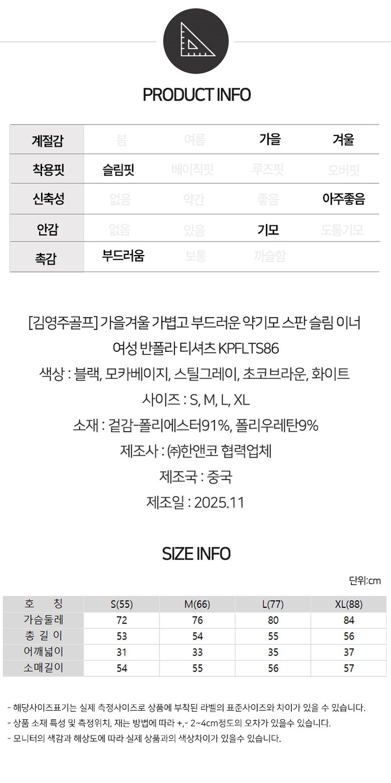 [김영주골프] 가을겨울 가볍고 부드러운 약기모 스판 슬림 이너 여성 반폴라 티셔츠 KPFLTS86