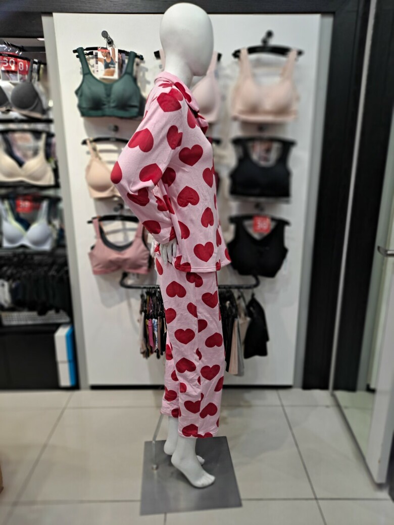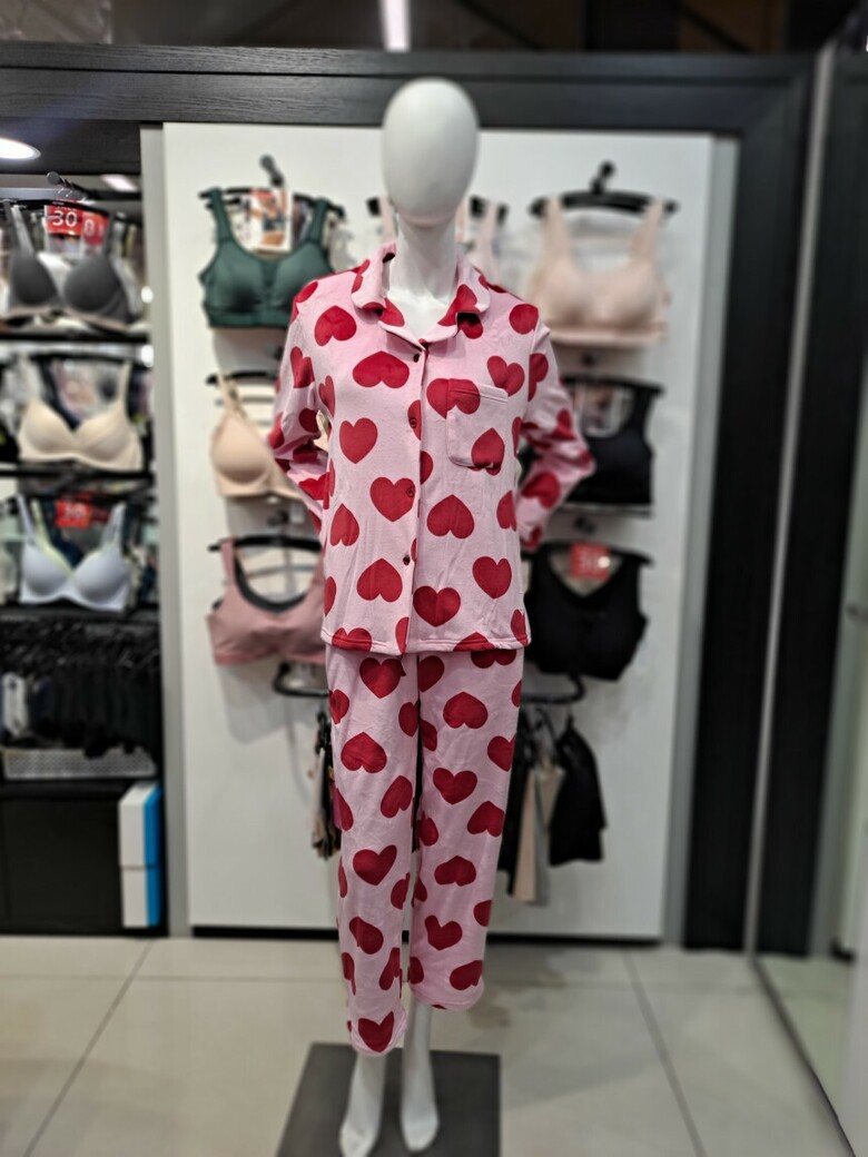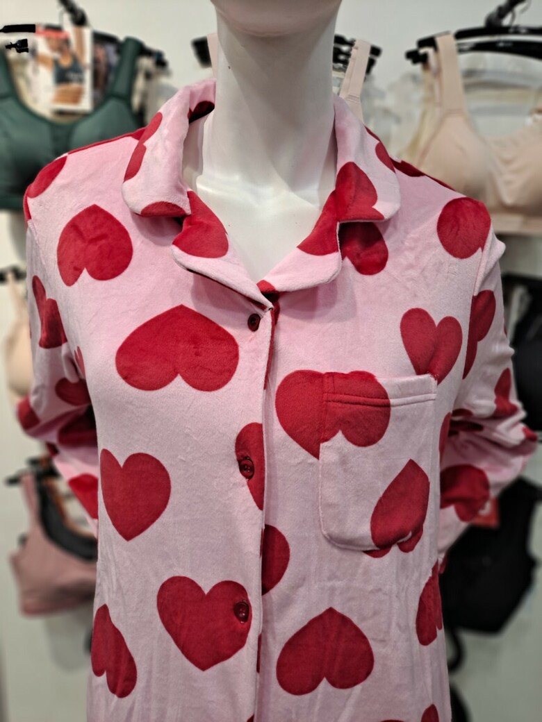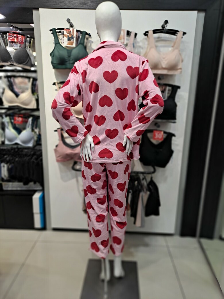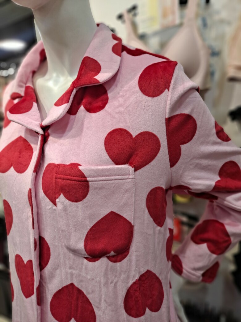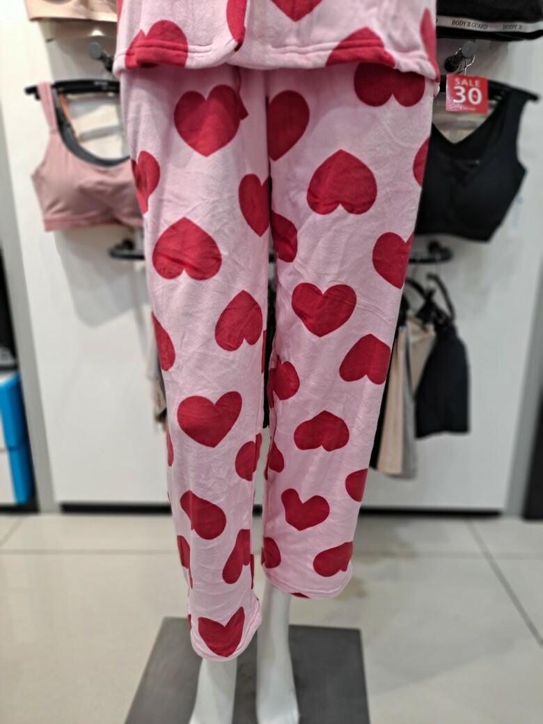 포근한 밍크스판 소재로 FW시즌 착용하기 좋음. 핑크 바탕에 레드 빅 하트 나염이 포인트가 되어 러블리한 더욱 러블리한 무드를 살려줌.