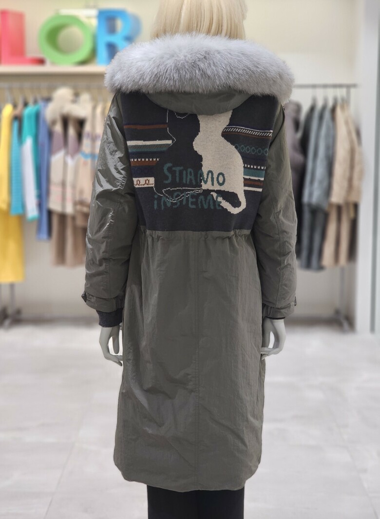 등판 니트 배새으로 캐주얼한 무드를 연출하는 폭스 퍼 구스 롱 패딩.