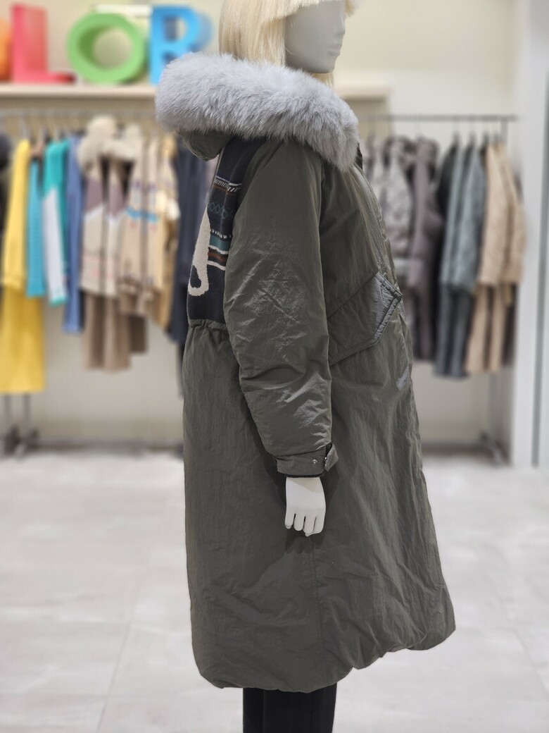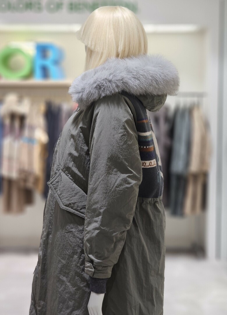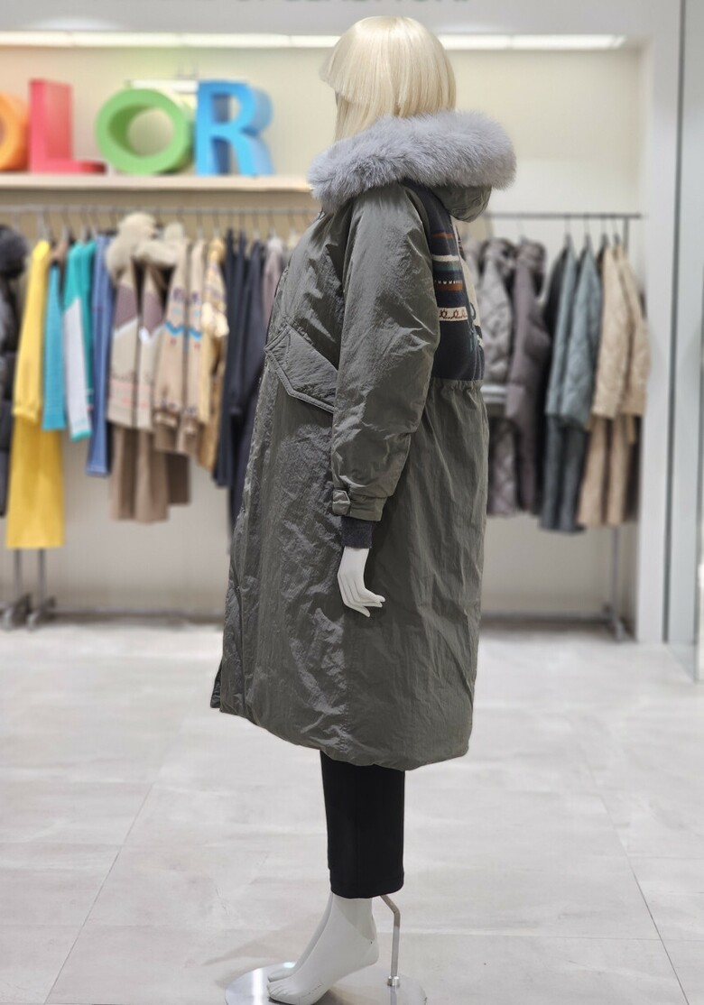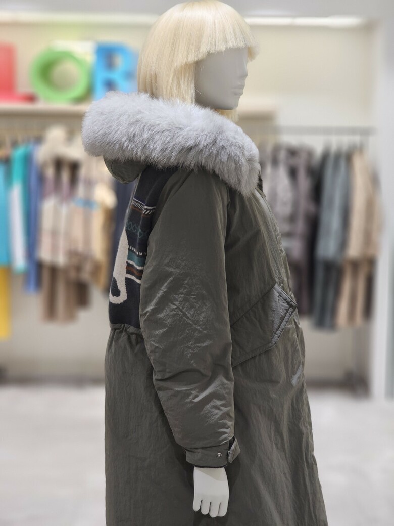 등판 니트 배새으로 캐주얼한 무드를 연출하는 폭스 퍼 구스 롱 패딩.