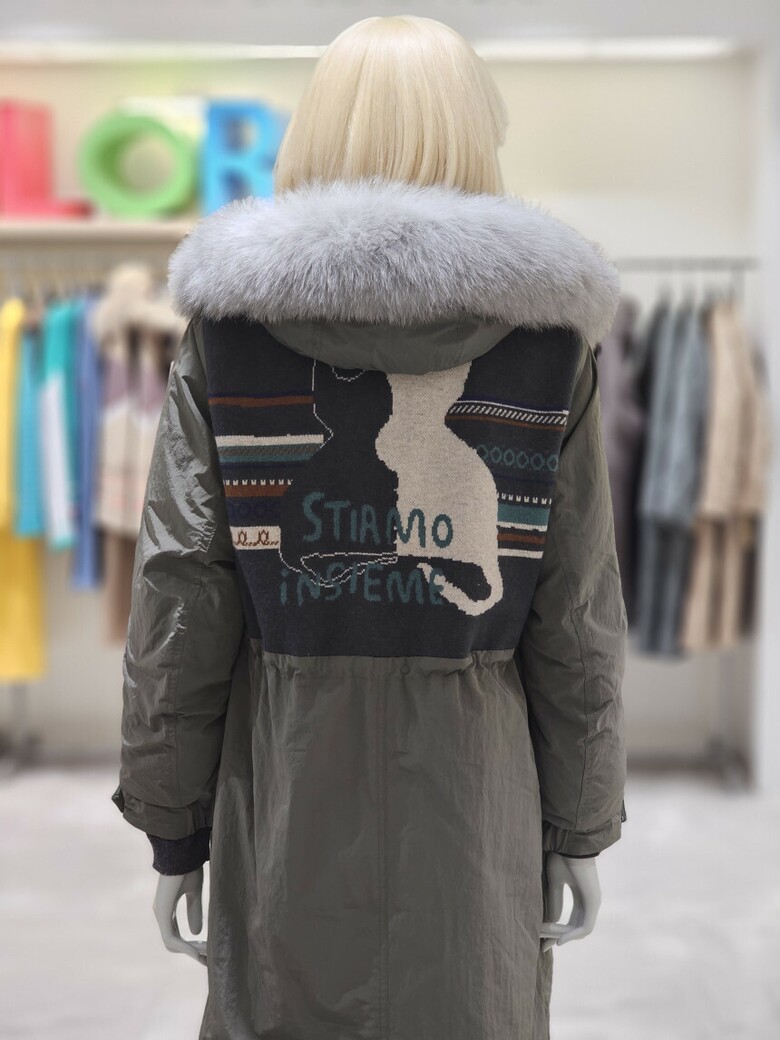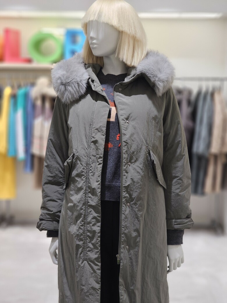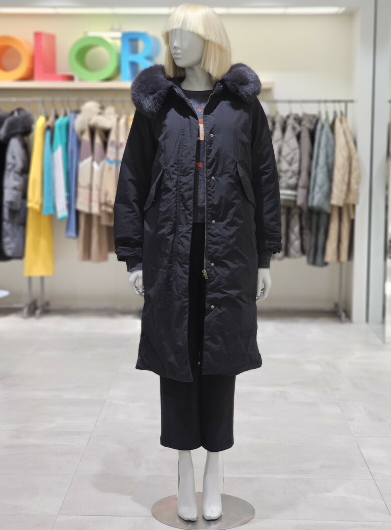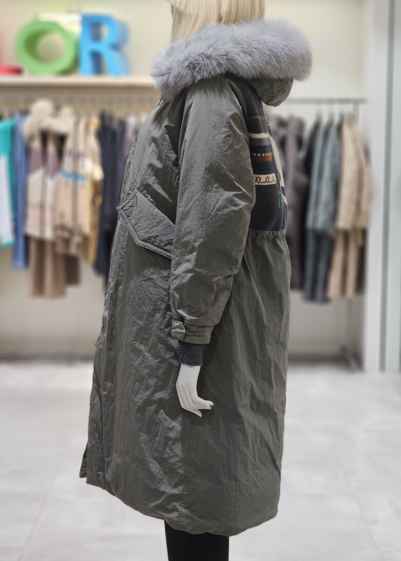 등판 니트 배새으로 캐주얼한 무드를 연출하는 폭스 퍼 구스 롱 패딩.