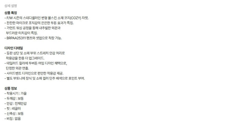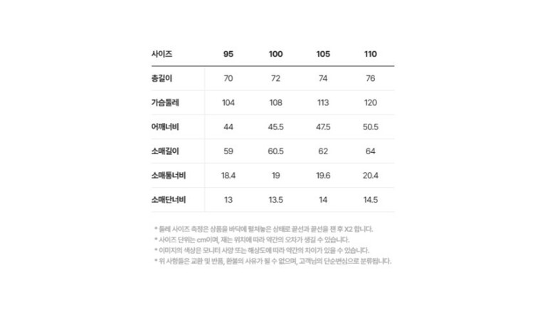 | 1. 제품 소재 (섬유의 조성 또는 혼용률을 백분율로 표시, 기능성인 경우 성적서 또는 허가서) | 상품상세참조 |