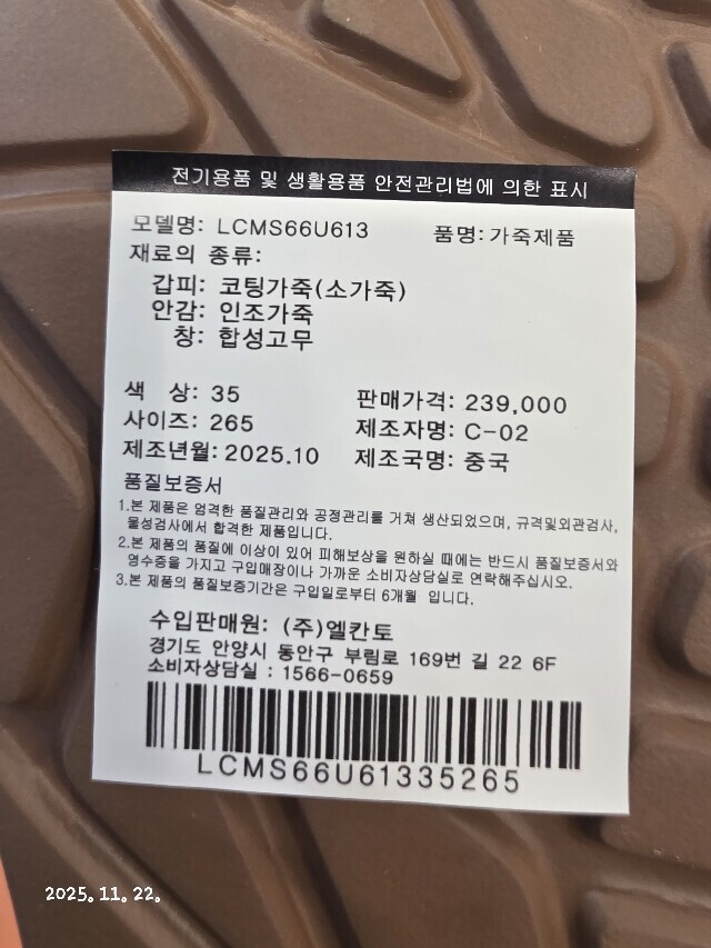 | 1. 제품 소재 (운동화인 경우에는 겉감, 안감을 구분하여 표시) | 상품상세참조 |