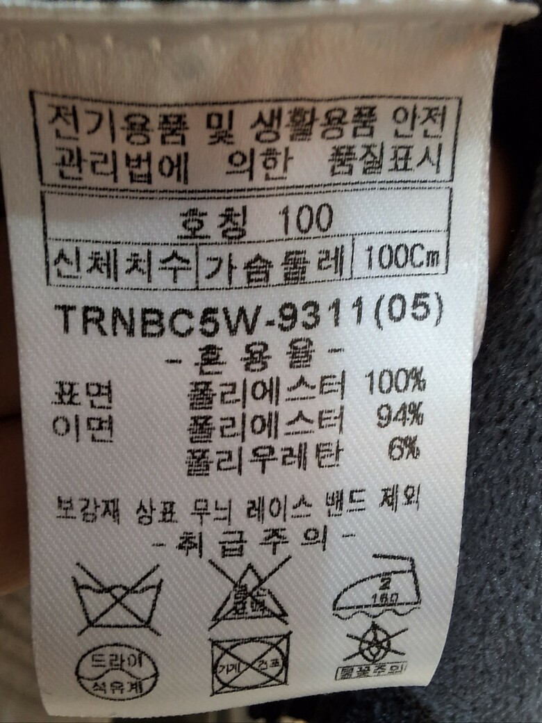 | 1. 제품 소재 (섬유의 조성 또는 혼용률을 백분율로 표시, 기능성인 경우 성적서 또는 허가서) | 니트, 폴리에스테르 100%, 폴리우레탄 6% |
