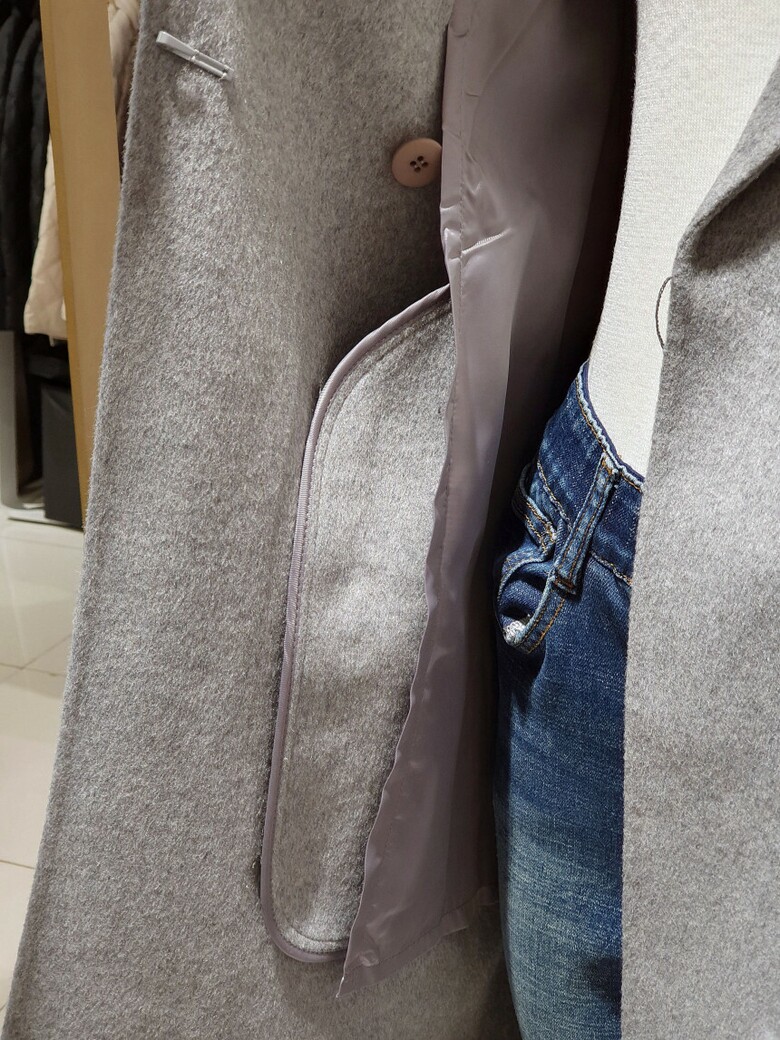여밈 라인 히든 단추와 히든 고리 클로징 가능한 핸드메이드 코트입니다.