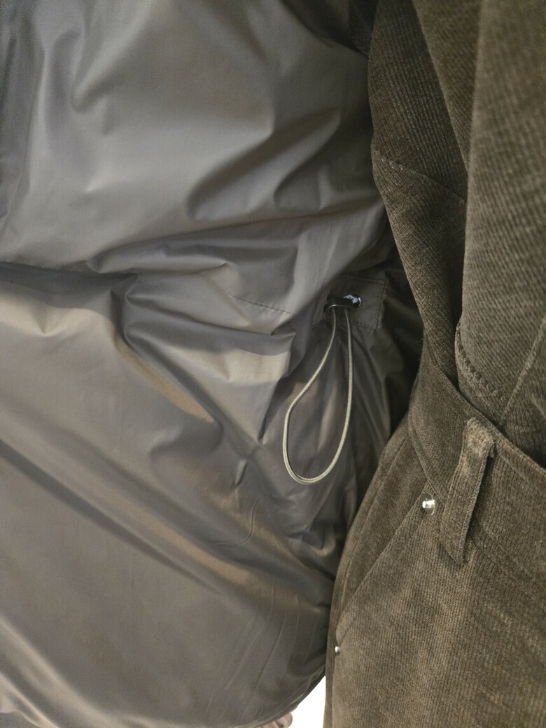 허리 안쪽 스트링연출되는 구스충전재 하프기장 점퍼입니다.