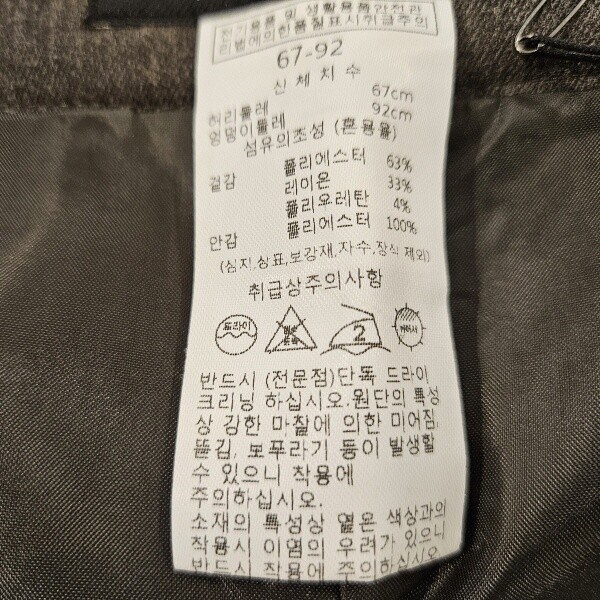 제품소재 : 겉감-폴리에스터63%, 레이온33%, 폴리우레탄4%, 안감-폴리에스터100%