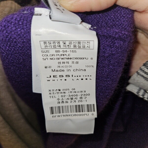 | 1. 제품 소재 (섬유의 조성 또는 혼용률을 백분율로 표시, 기능성인 경우 성적서 또는 허가서) | 캐시미어100% |