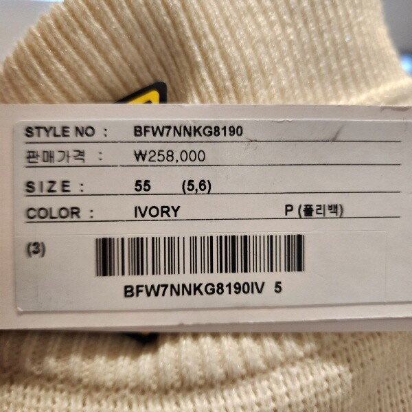 | 1. 제품 소재 (섬유의 조성 또는 혼용률을 백분율로 표시, 기능성인 경우 성적서 또는 허가서) | 아크릴100%배색 아크릴90%,폴리에스터6%,메탈사4% |