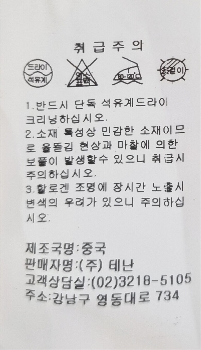 | 6. 세탁방법 및 취급시 주의사항 | 1.반드시 단독 석유계 드라이크리닝하십시오. 2.소재 특성상 민감한 소재이므로 올뜯김현상과 마찰에 의한 보풀이 발생할 수 있으니 취급시 주의하십시오. 3.습윤시 마찰에 의한 이염현상에 주의하십시오. |