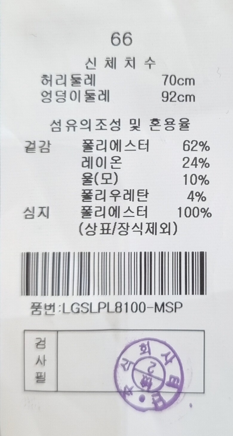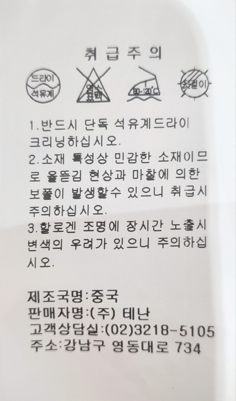 | 6. 세탁방법 및 취급시 주의사항 | 1.반드시 단독 석유계 드라이크리닝하십시오. 2.소재 특성상 민감한 소재이므로 올뜯김현상과 마찰에 의한 보풀이 발생할 수 있으니 취급시 주의하십시오. 3.습윤시 마찰에 의한 이염현상에 주의하십시오. |