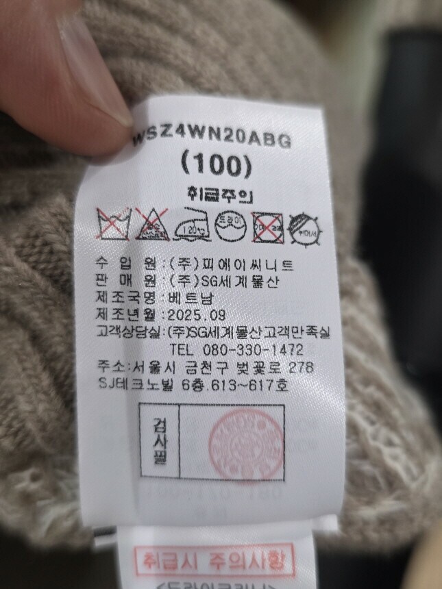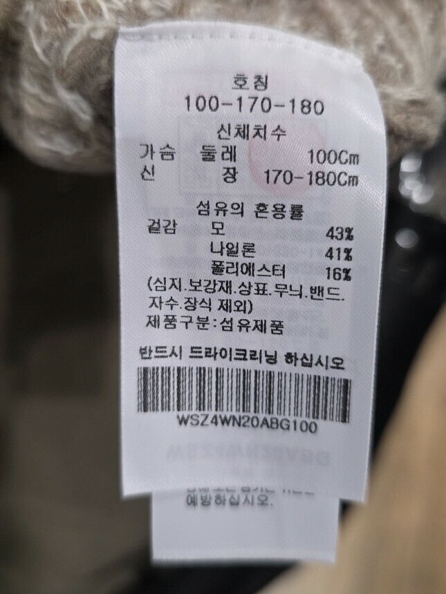겉감 : 모 43% , 나일론 41% , 폴리에스터 16%