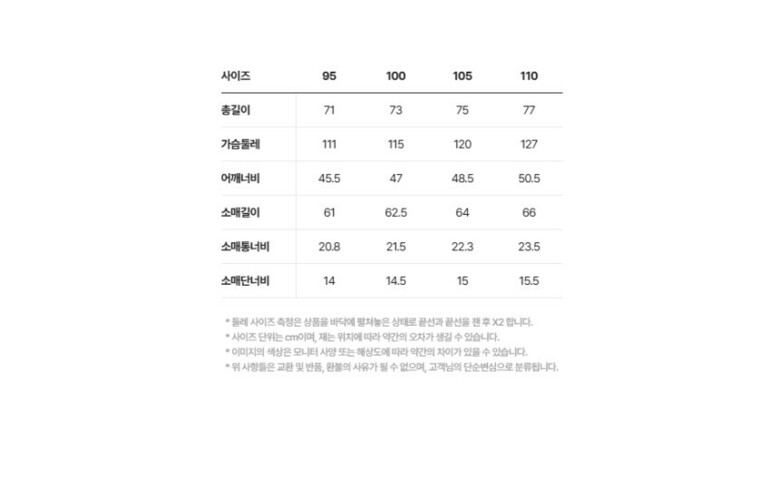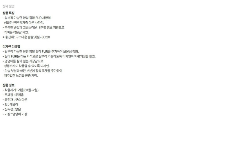 | 1. 제품 소재 (섬유의 조성 또는 혼용률을 백분율로 표시, 기능성인 경우 성적서 또는 허가서) | 상품상세참조 |