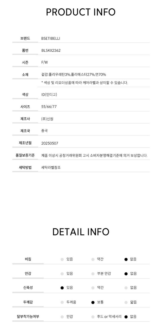 | 1. 제품 소재 (섬유의 조성 또는 혼용률을 백분율로 표시, 기능성인 경우 성적서 또는 허가서) | 상품상세참조 |