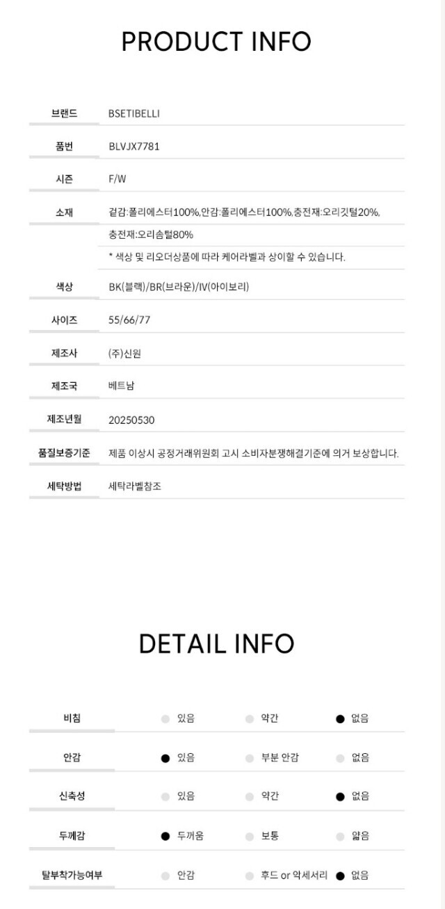 | 1. 제품 소재 (섬유의 조성 또는 혼용률을 백분율로 표시, 기능성인 경우 성적서 또는 허가서) | 상품상세참조 |