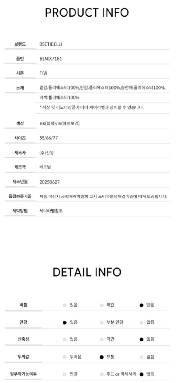 | 1. 제품 소재 (섬유의 조성 또는 혼용률을 백분율로 표시, 기능성인 경우 성적서 또는 허가서) | 상품상세참조 |