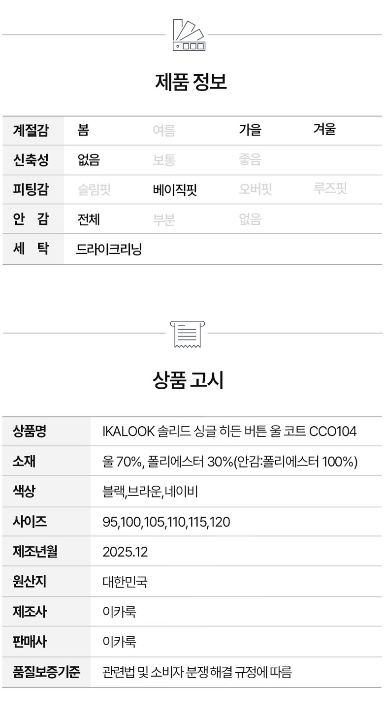 IKALOOK 솔리드 싱글 히든 버튼 울 코트 CCO104