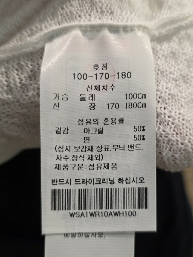 | 1. 제품 소재 (섬유의 조성 또는 혼용률을 백분율로 표시, 기능성인 경우 성적서 또는 허가서) | 겉감 : 면 50% , 아크릴 50% (심지,보강재,상표,무늬,밴드,자수,장식 |
