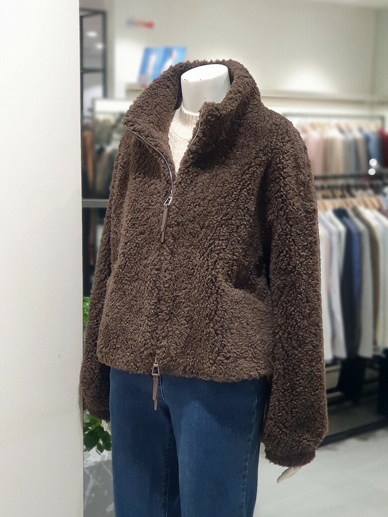 하이 넥 라인에 투 웨이 지퍼 클로징 가능한 부클레 재킷입니다.