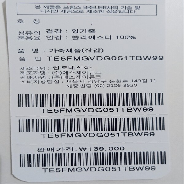 | 2. 소재 | 겉감 ,양가죽100% 안감,폴리에스터100% |