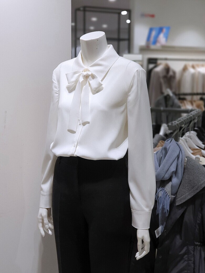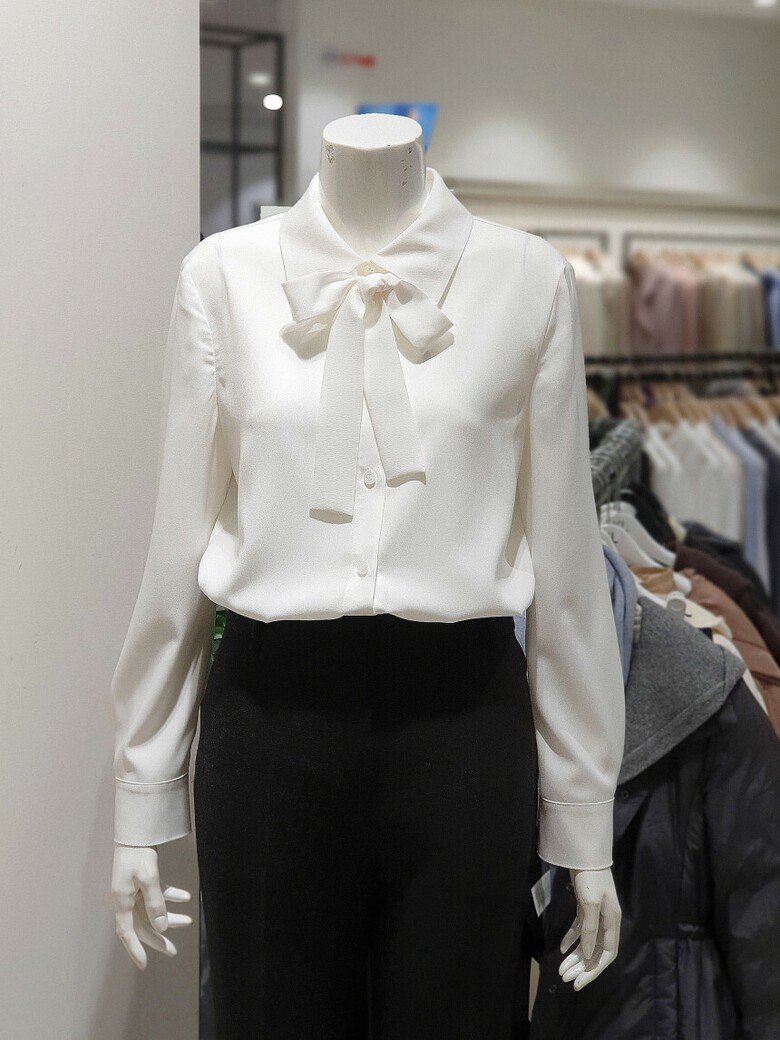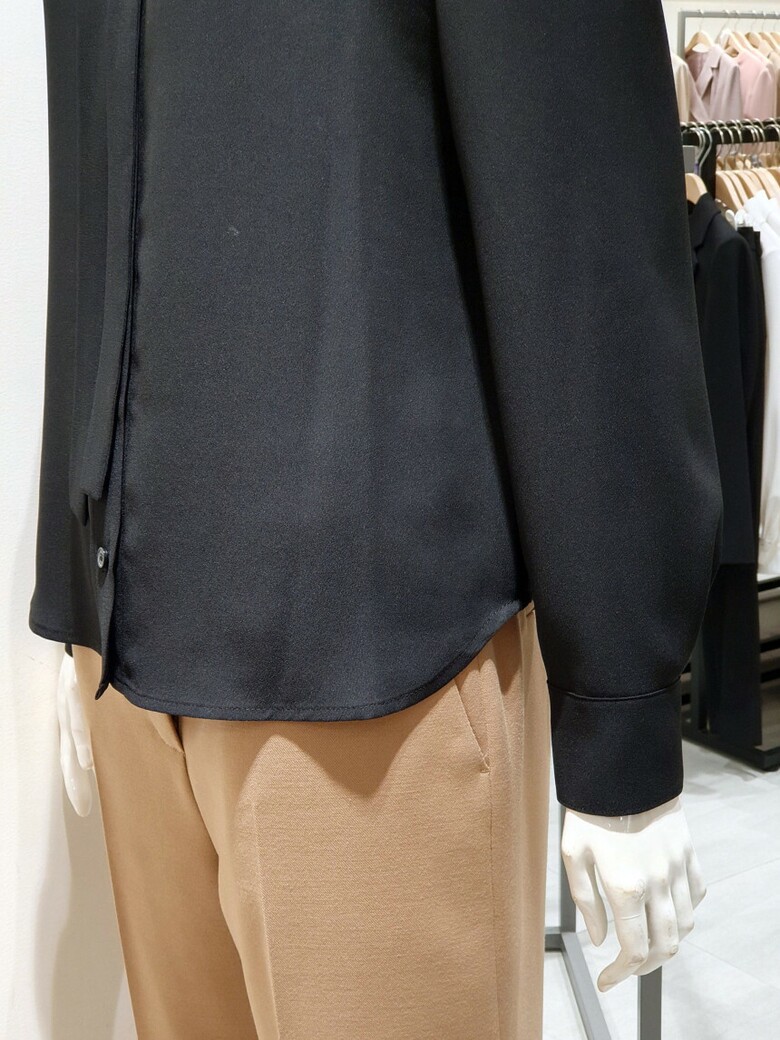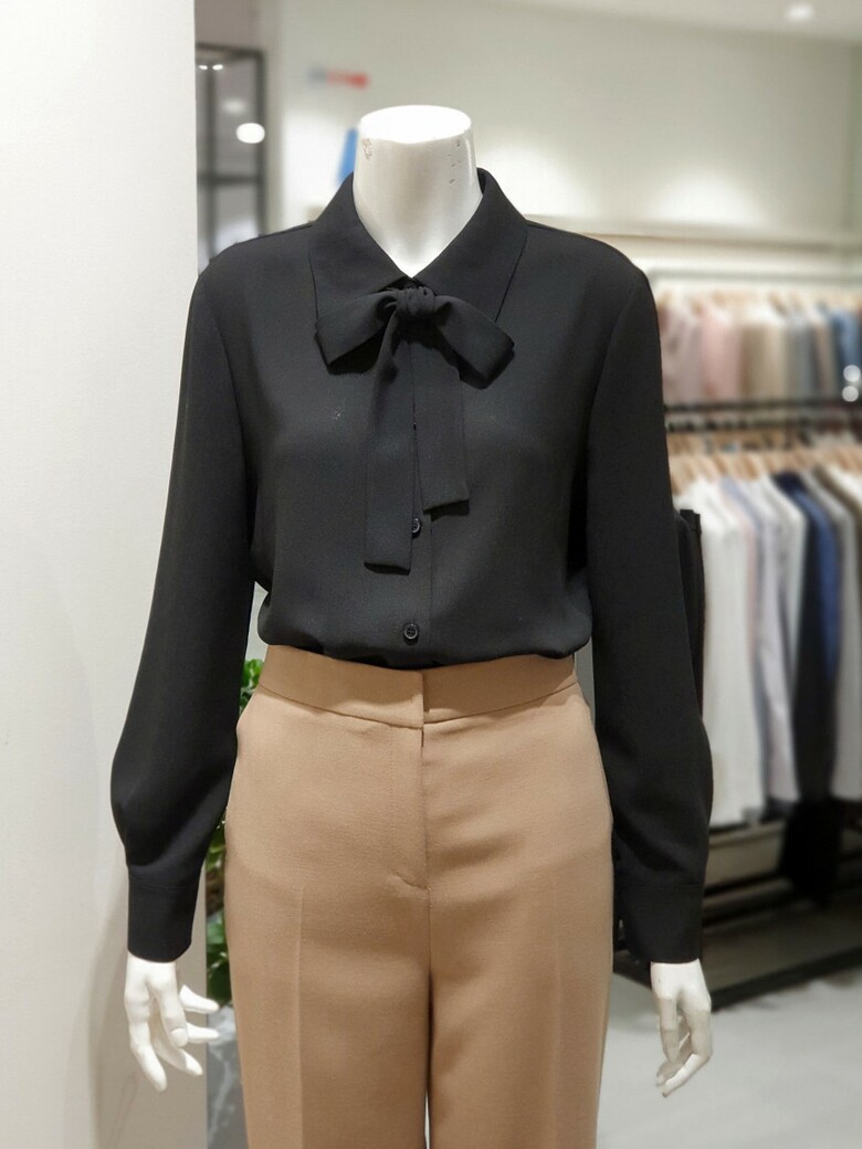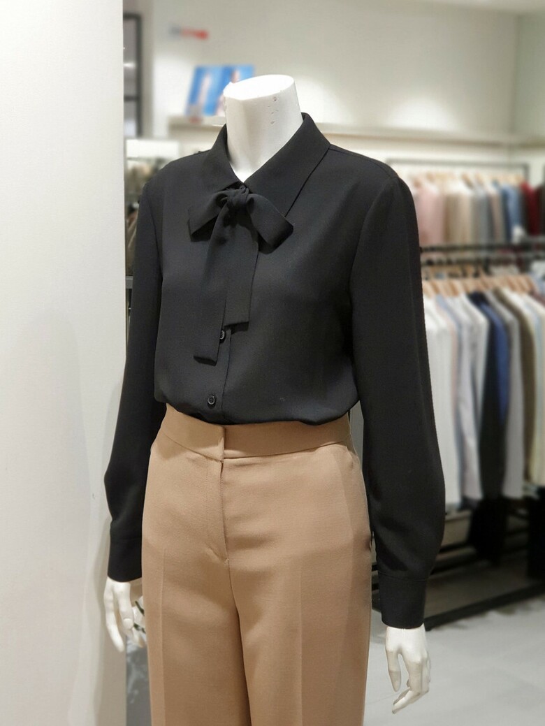 넥 라인의 리본 타이가 포인트가 되는 클래식한 무드의 블라우스입니다.