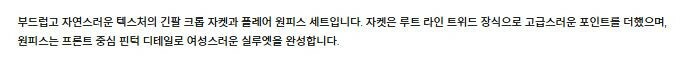 | 1. 제품 소재 (섬유의 조성 또는 혼용률을 백분율로 표시, 기능성인 경우 성적서 또는 허가서) | 상품상세참조 |
