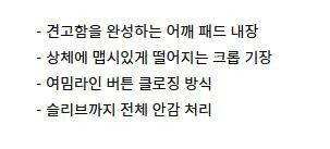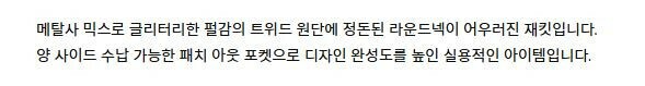 | 1. 제품 소재 (섬유의 조성 또는 혼용률을 백분율로 표시, 기능성인 경우 성적서 또는 허가서) | 상품상세참조 |
