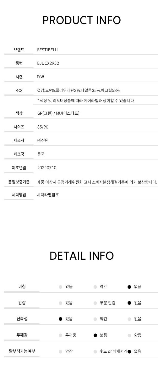 1. 제품 소재 (섬유의 조성 또는 혼용률을 백분율로 표시, 기능성인 경우 성적서 또는 허가서) 상품상세참조