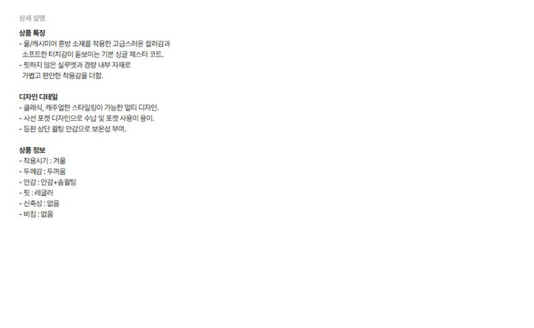 | 1. 제품 소재 (섬유의 조성 또는 혼용률을 백분율로 표시, 기능성인 경우 성적서 또는 허가서) | 상품상세참조 |