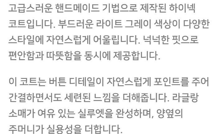 | 1. 제품 소재 (섬유의 조성 또는 혼용률을 백분율로 표시, 기능성인 경우 성적서 또는 허가서) | 상품상세참조 |
