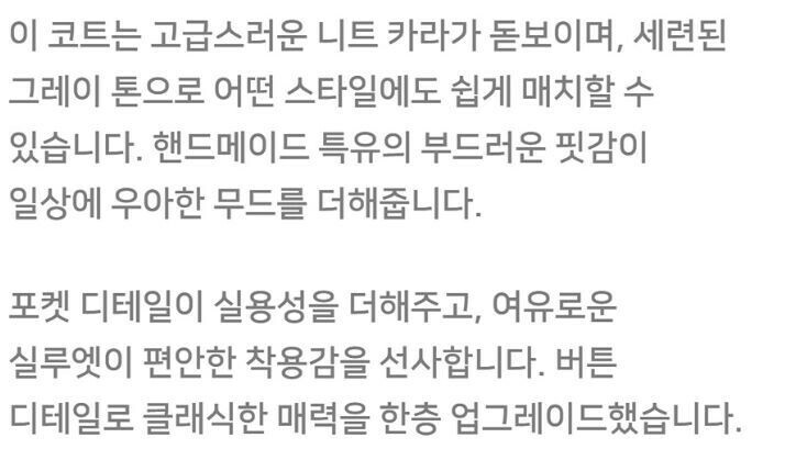 | 1. 제품 소재 (섬유의 조성 또는 혼용률을 백분율로 표시, 기능성인 경우 성적서 또는 허가서) | 상품상세참조 |